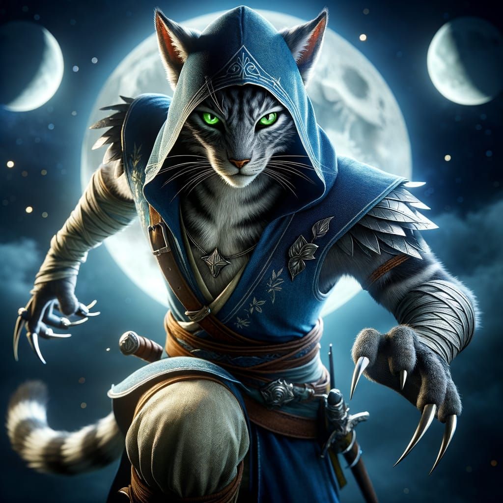 A striking image of a male Khajiit in a powerful fighting pose, with glowing green eyes and gray striped fur, set against a serene night sky featuring two silver moons. The scene is captured in a professional photo style with a bokeh effect, emphasizing the subject's sharp features and fierce demeanor.