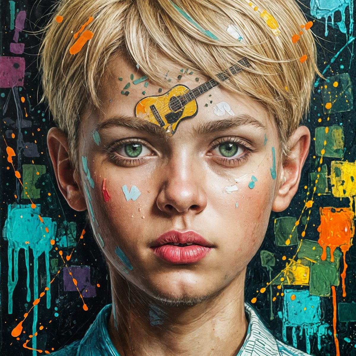 This image features a highly textured, abstract impasto oil portrait of a blond boy. It uses bold, clashing colors and a double exposure technique overlaying a guitar scene.