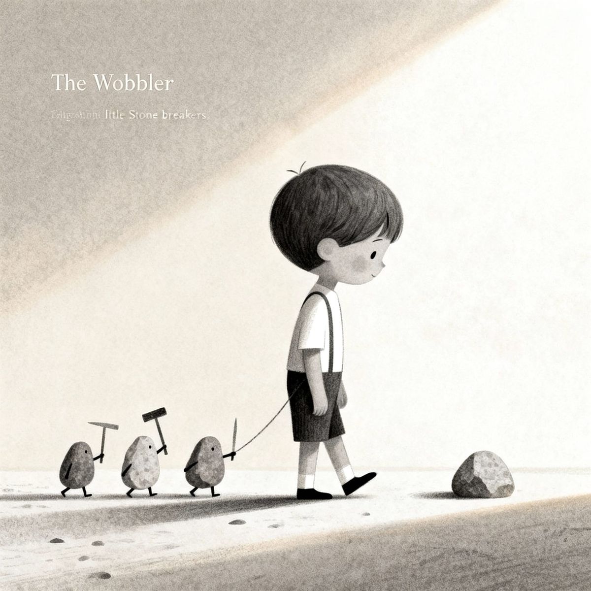 A charming children's book illustration featuring a cute boy and his friends, rendered in a contemporary style with clean lines and a muted color palette. The art emphasizes modern elegance and visual poetry through minimal detail.