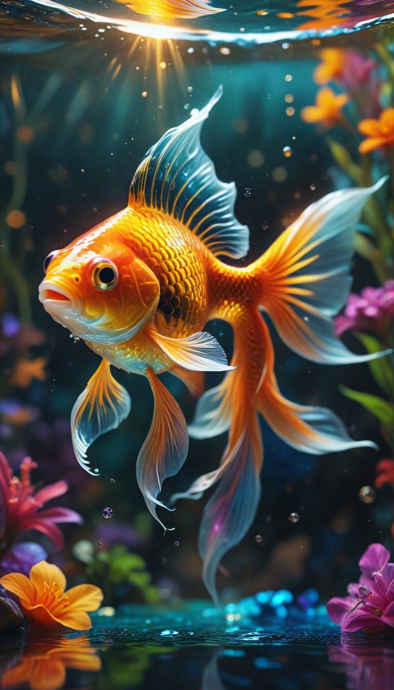This image shows a hovering goldfish champion adorned with flowing fins. The artwork features vibrant, shimmering rainbow colors and a glossy glass texture, set against magical glowing flowers in a soft focus with a bokeh effect. The image is as digital fantasy art.