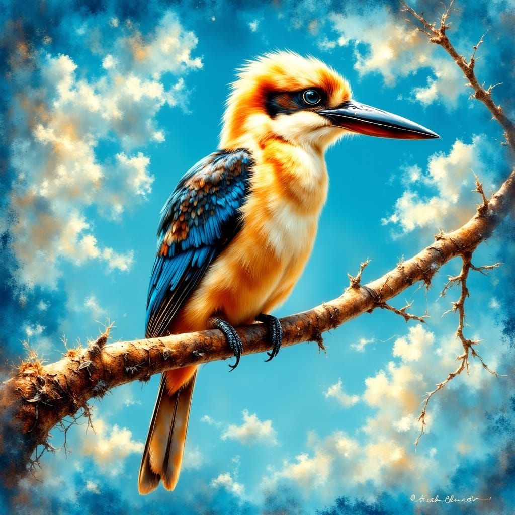 This image shows a vibrant, 80s-style airbrush graphic of a kookaburra on a branch against a blue sky. The design evokes vintage airbrush graphics with smooth lines and subtle color shifts.