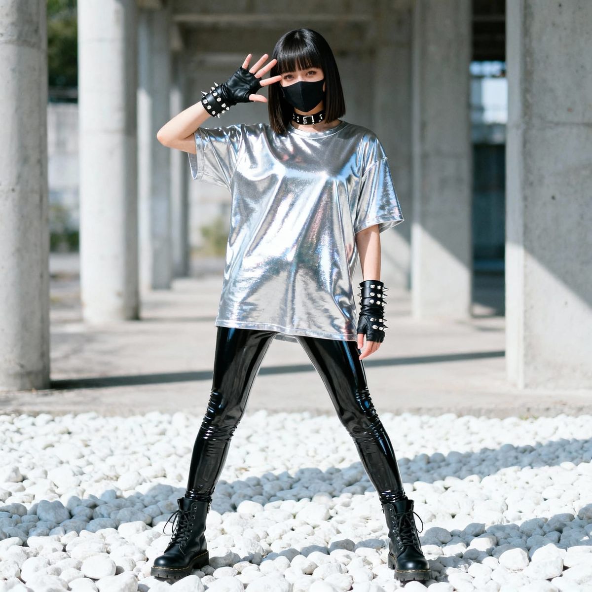 A stylish woman poses assertively in an urban industrial setting. She wears a metallic silver t-shirt, latex leggings, and combat boots, with edgy accessories and a face mask. Bright, natural light illuminates the scene.