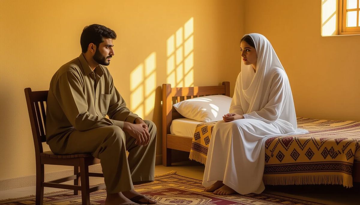 A photorealistic image of a young man listening intently to a young woman in a sunlit, clay-walled room. The scene evokes a sense of quiet intimacy and cultural richness.