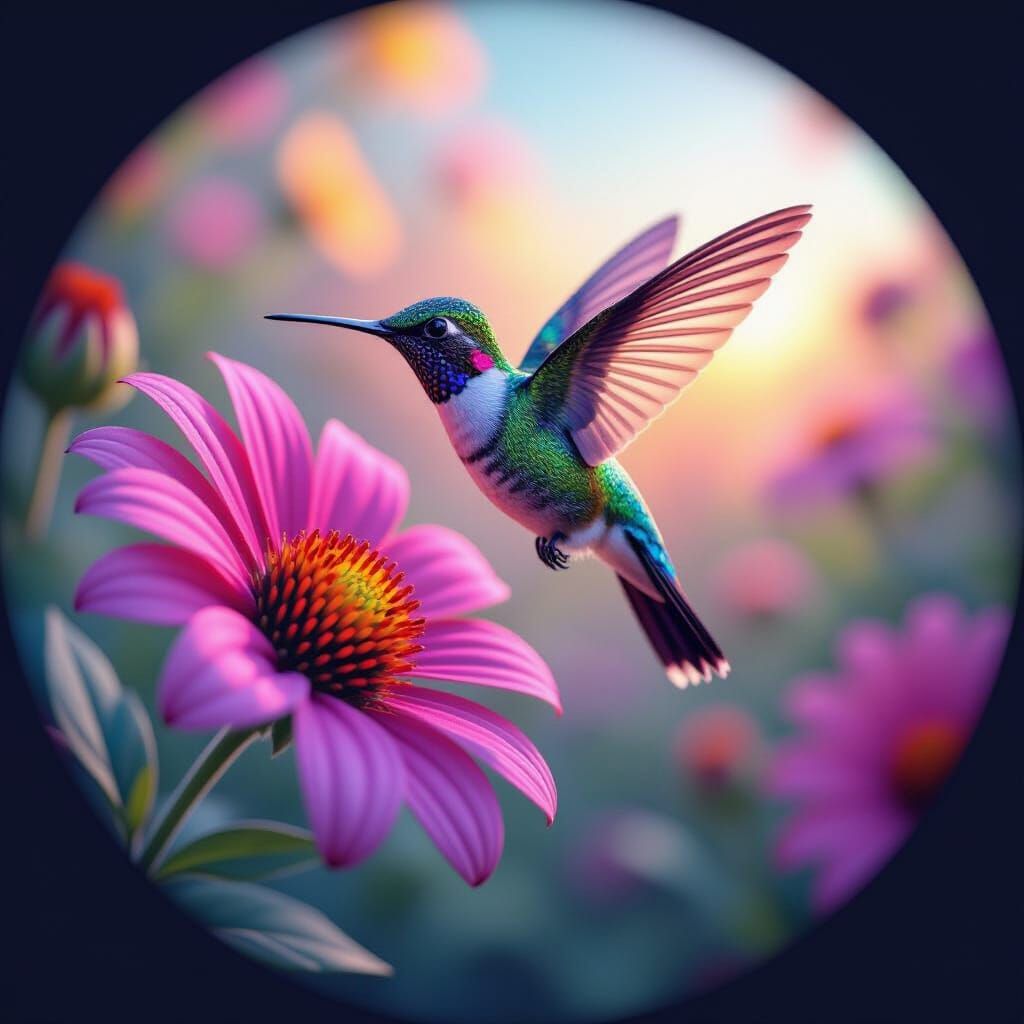 This image shows a hummingbird with shimmering feathers flying in front of a colorful, blooming flower. Captured with a wide-angle lens, it features swirling pink, purple, and yellow hues for a dreamy, ethereal look.