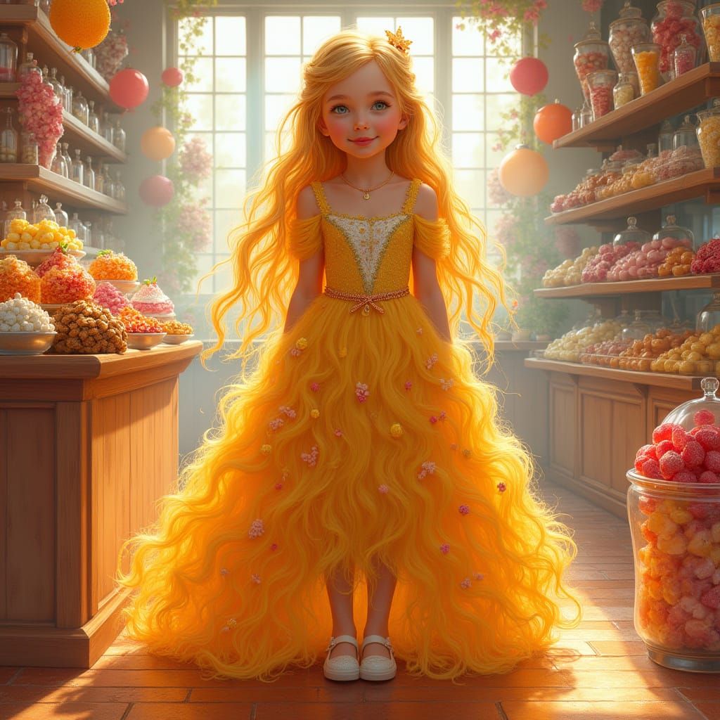 A digital painting of a girl with golden hair in a candy store. The vivid colors and glossy textures create a whimsical scene reminiscent of colored pencil art.