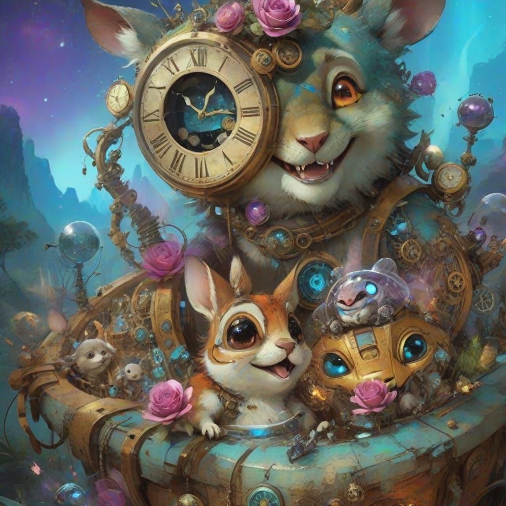 A digital matte painting of a clockpunk village made of glass and crystal roses. The artwork features cinematic lighting and intricate details, with adorable animals playing.