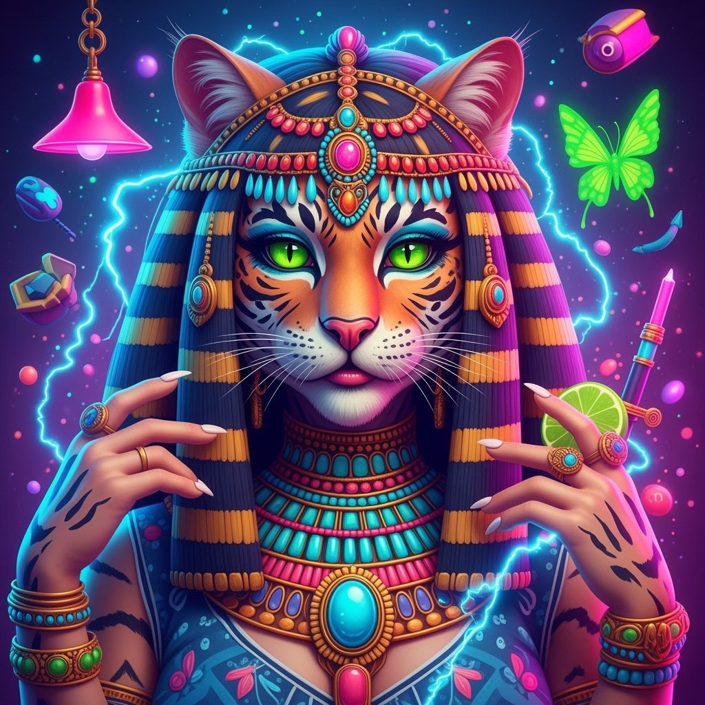 This image features a detailed goth Egyptian cat woman with colorful jewelry and makeup, rendered in a vibrant cutecore aesthetic with neon and electric colors and glowing accents.