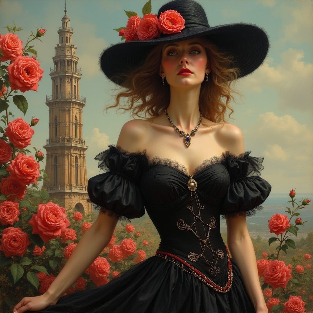 Ao pé da torre coberta por rosas vermelhas, ela surgia como uma lenda renascida. Os cabelos negros como breu dançavam ao vento, contrastando com o dourado vibrante de seu vestido. Na cintura, preso por um fino cinto de renda, um medalhão oval trazia a inscrição "BG", brilhando como sol de verão. A arquitetura ...