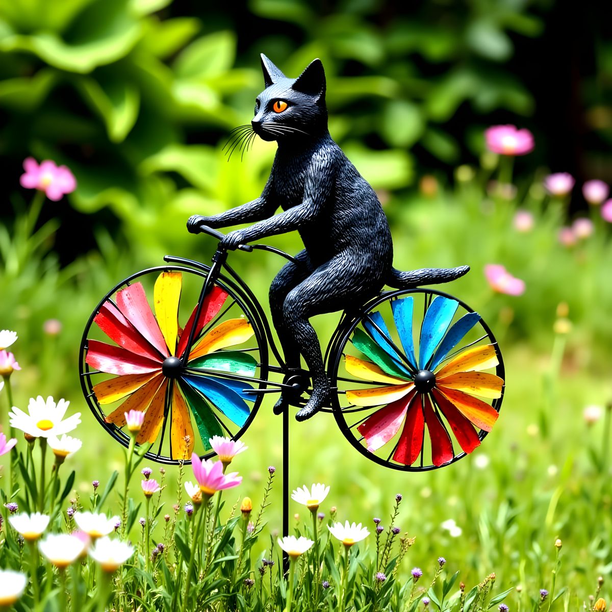 This image shows a black cat sculpture riding a bicycle weathervane. It's a detailed metal sculpture with rainbow-colored wind turbine blades, set in a lush garden with wildflowers in a folk art style.