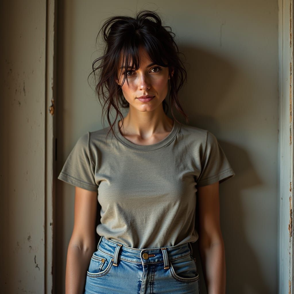 A realistic portrait of a woman in worn denim jeans and a band t-shirt, with a messy hairstyle. The image uses warm, natural lighting and evokes charcoal sketch techniques.