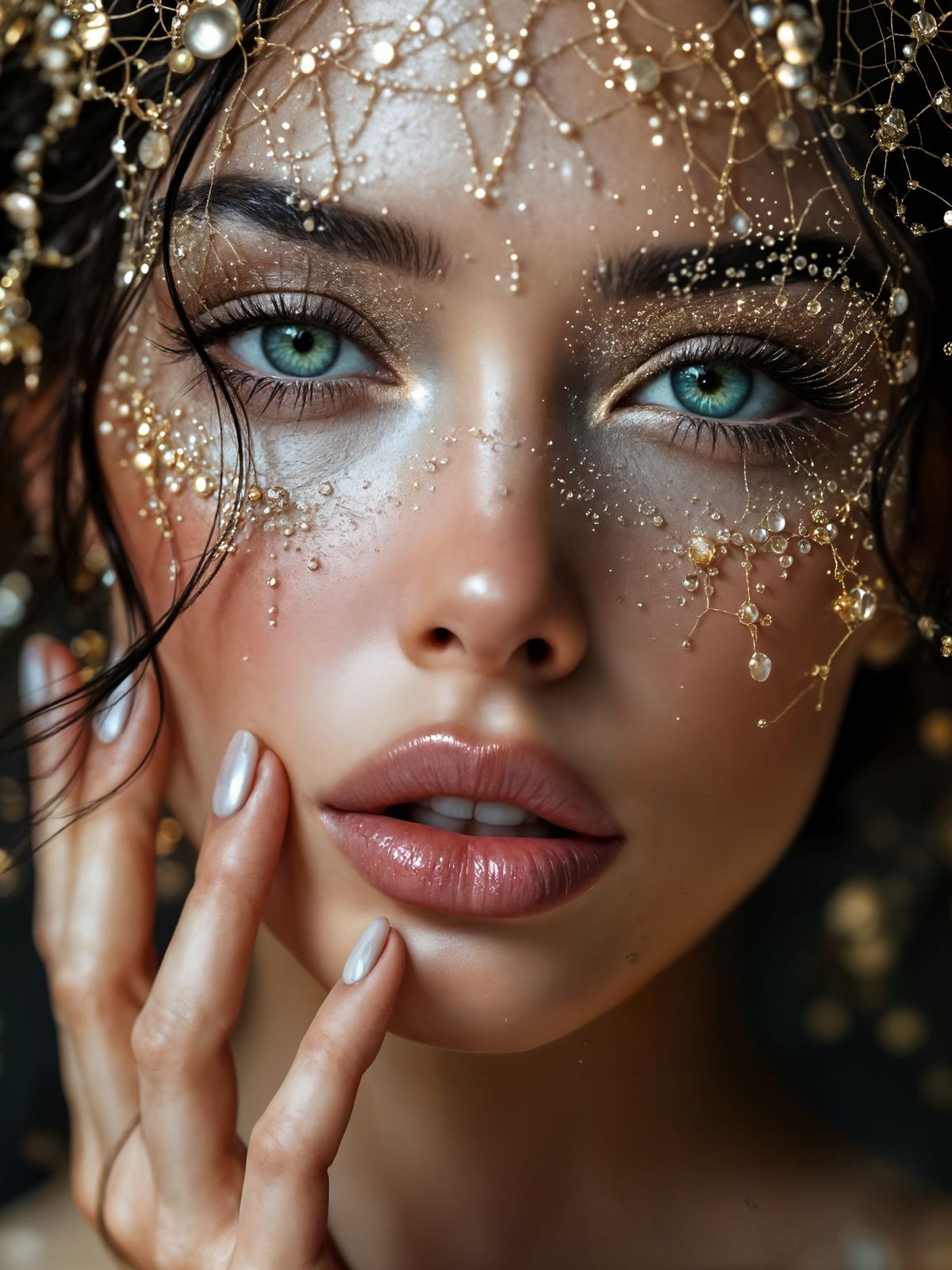 Gorgeous high fashion model haute couture face, detailed eyes, real skin, shining gold drops, conceptual, symmetrical, (wearing intricate structural high heels), intricate, realistic skin, 3D masterpiece, perfect composition, highly textured, Hyperrealistic, splash art, concept art, mid shot, intricately ...