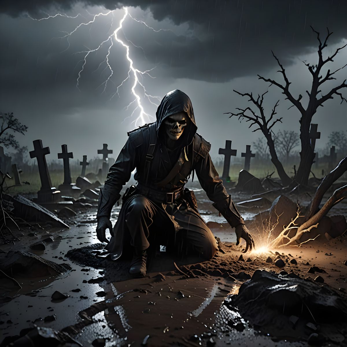 A vivid scene of a grave robber kneeling before a tomb during a thunderstorm. A skeletal hand emerges from the earth. The image captures a tense, wet, and terrifying atmosphere with cinematic lighting.