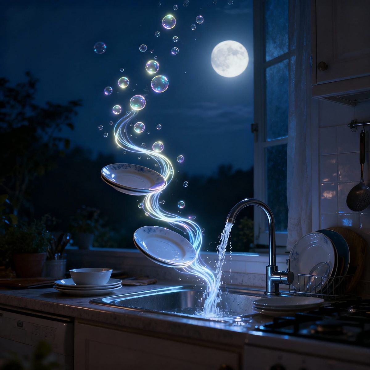 This image captures a surreal midnight kitchen scene where dishes hover, water flows like light, and bubbles ascend. Features dreamlike realism and cinematic lighting.