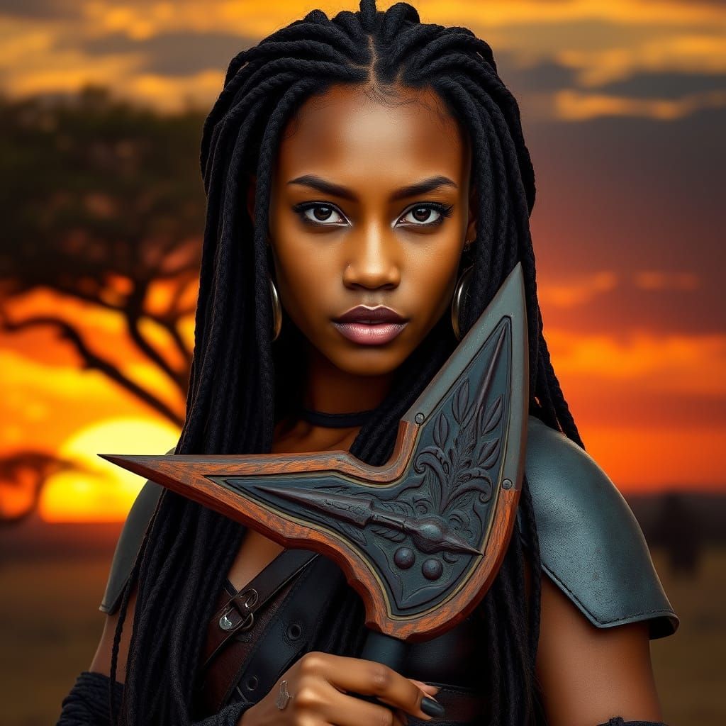 A captivating image shows a woman with dreadlocks and amber eyes in leather armor, holding a spear. The setting is an African savanna at sunset, with art nouveau influences.
