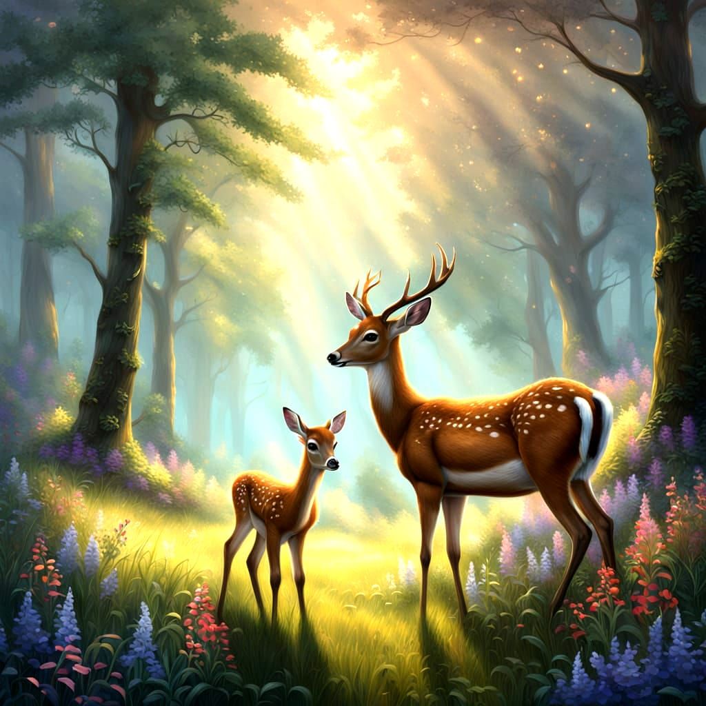 This enchanting image depicts a serene forest landscape with a lush meadow in the foreground. A doe and her fawn rest peacefully, surrounded by vibrant wildflowers. The scene is imbued with a soft, ethereal quality reminiscent of dreamlike fantasy worlds.