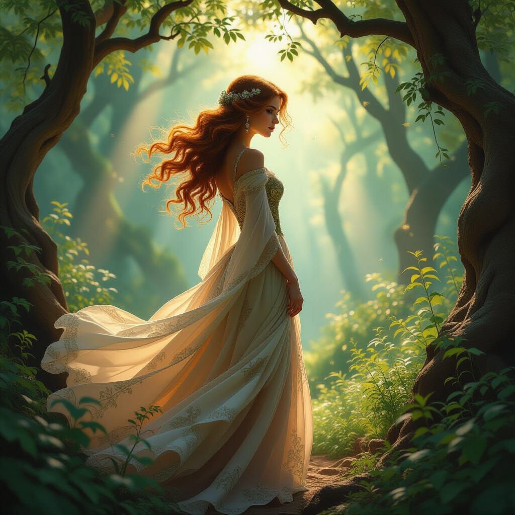 A striking image of a lady with auburn hair in an elaborate historical gown within an ancient forest. Sunlight filters through the trees, creating an ethereal atmosphere in a painterly, richly detailed style.