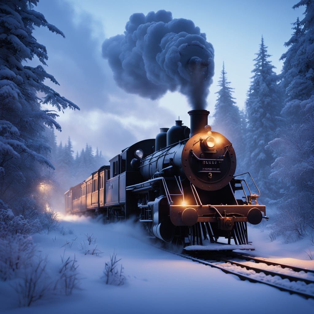 This image showcases a vintage steam train journeying through a snow-covered forest during twilight. Photorealistic details and dramatic lighting create a captivating scene.