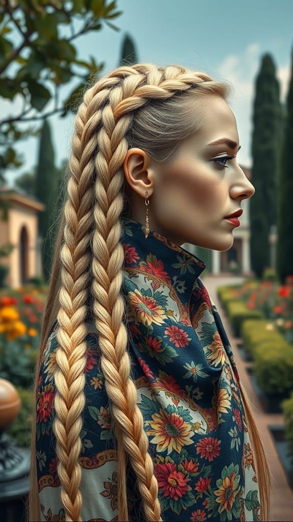 Headshot of beautiful geometric patterned woman with long golden hair tied up in braids with a Surreal scarf of Printed silk twill carré of an Italian garden as it aims to merge the conscious & unconscious realms, often depicting dream-like or illogical scenes within a realistic context. The image blends ...
