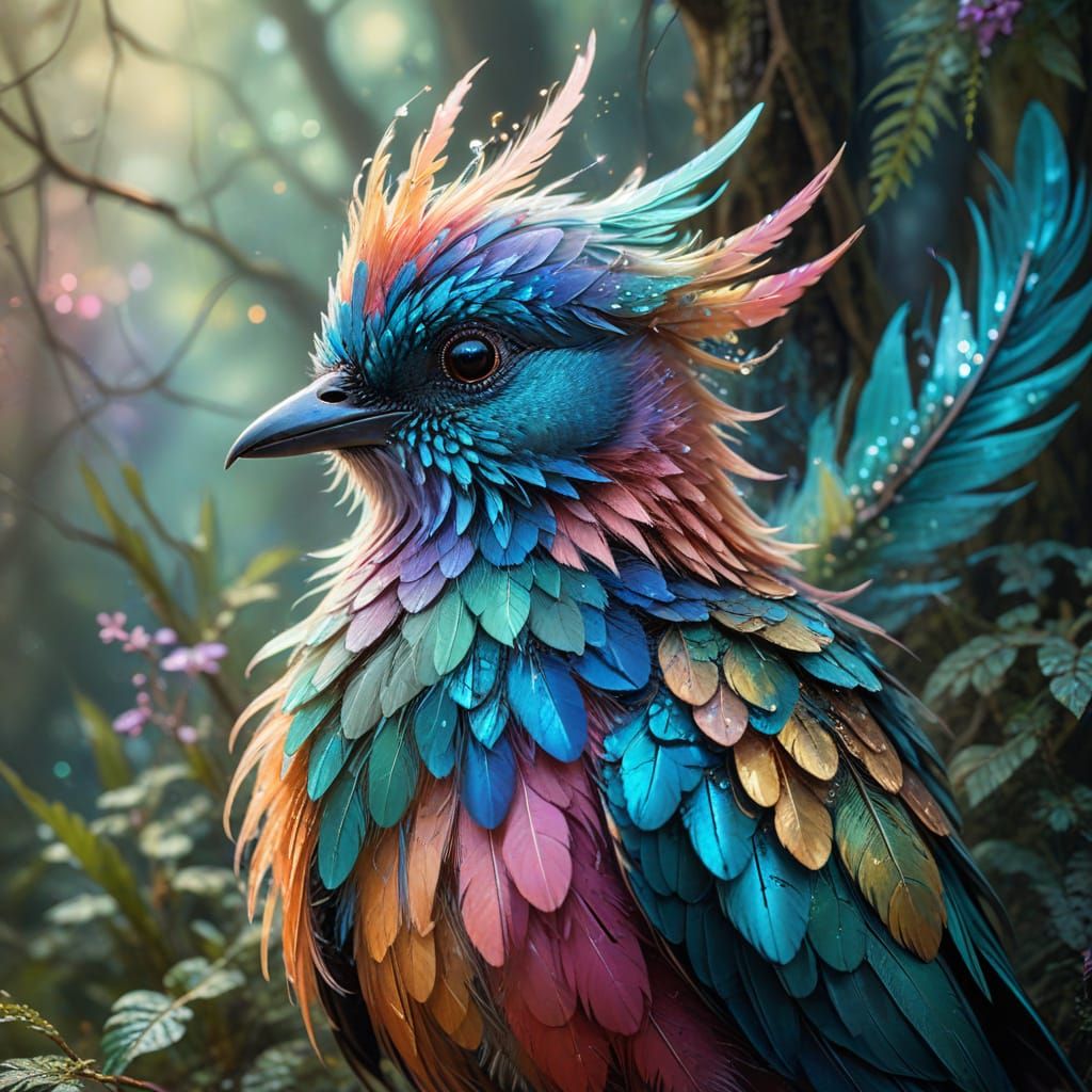 A striking picture of a bird with elaborate feathers glowing in a magical forest scene. This fantasy art piece features triadic colors and jewel-like details, with soft, ethereal light shining through the mist.