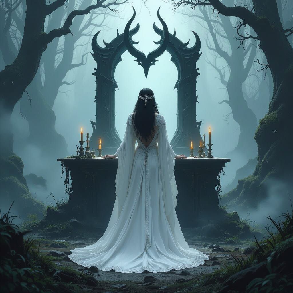 This image shows a woman in white robes at an altar in a misty forest. The art style evokes a fantasy aesthetic, with intricate details and atmospheric lighting.