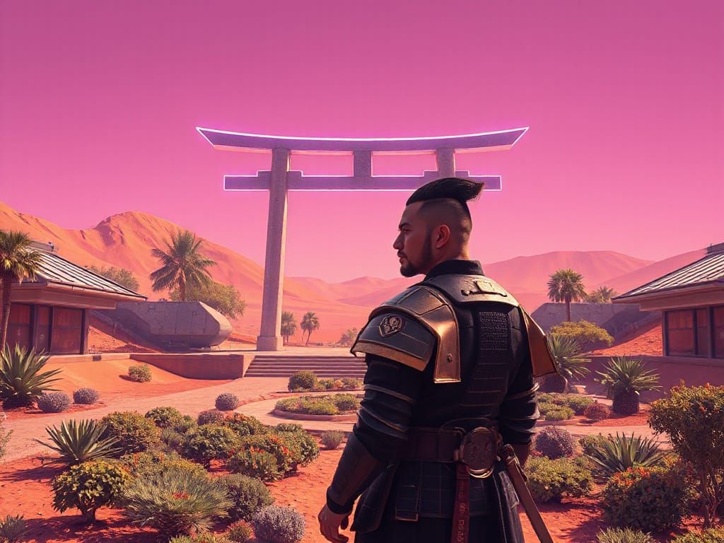 This image depicts a futuristic, high-tech samurai in a serene, solar-powered garden on Mars, surrounded by sleek architecture and a holographic torii gate with a glitchy effect, in a vaporwave-inspired palette reminiscent of Syd Mead's sci-fi aesthetic