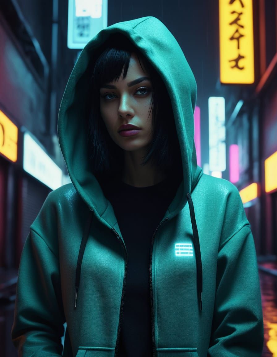 This image shows a black-haired woman in a hoodie, set against a glossy white plaza in an eco-cyberpunk aesthetic. The scene features film noir shadows, neon accents, and a moody monochromatic palette.