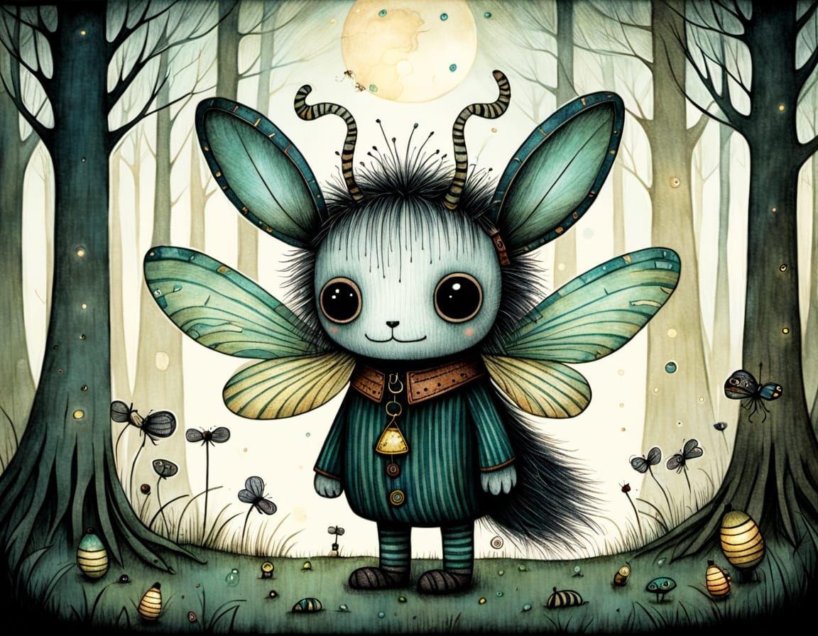 This image shows an adorable fantasy creature with long ears, stripes, and insectoid eyes in an enchanted forest. Fireflies illuminate the simple colored pencil illustration.