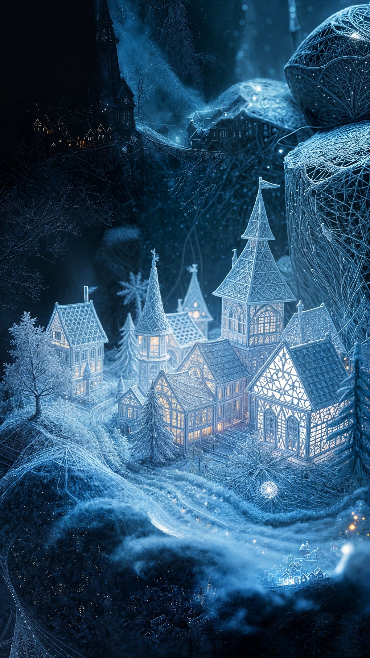 This image shows a fantasy village covered in intricate, frosty lace patterns, set against a black, shining background, with neon threads and shimmering powder creating a mesmerizing, high-resolution scene.