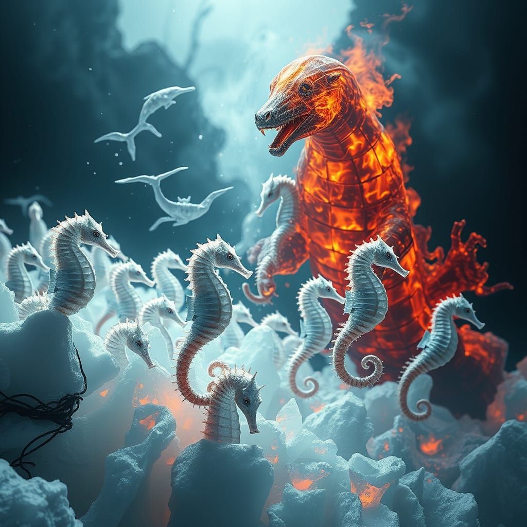 A hyperrealistic scene of frozen seahorses sculpted from ice being pursued by a sea lion composed of flames. The image features cinematic lighting and atmospheric effects.