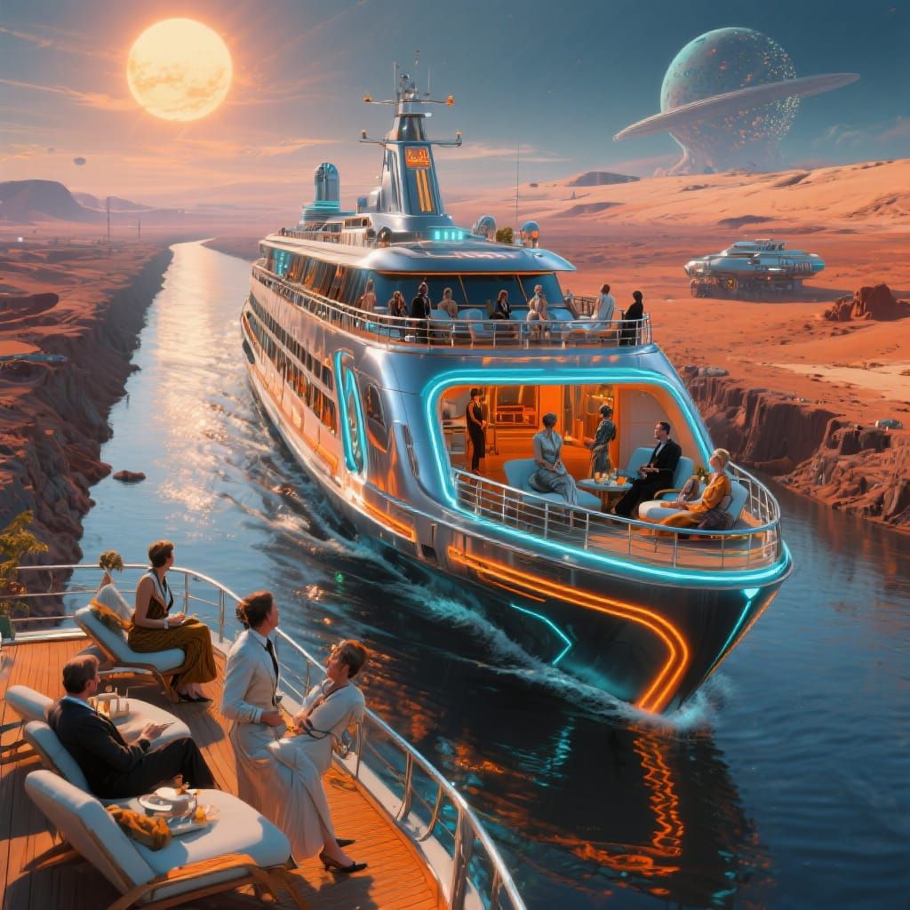 This image shows a futuristic cruise ship sailing on a Martian canal. Passengers relax on deck in a retro-futuristic art deco style, with vibrant colors reminiscent of digital sci-fi art.