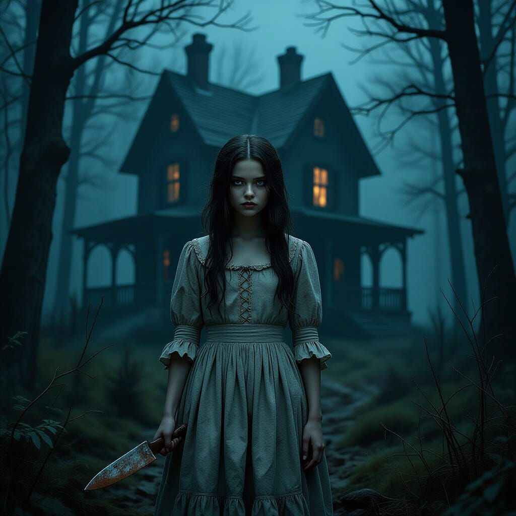 This image depicts a creepy cottage nestled in dark woods, featuring a mysterious young lady in a tattered dress holding a rusty knife. The atmosphere is eerie, with dramatic shading and ominous landscapes.