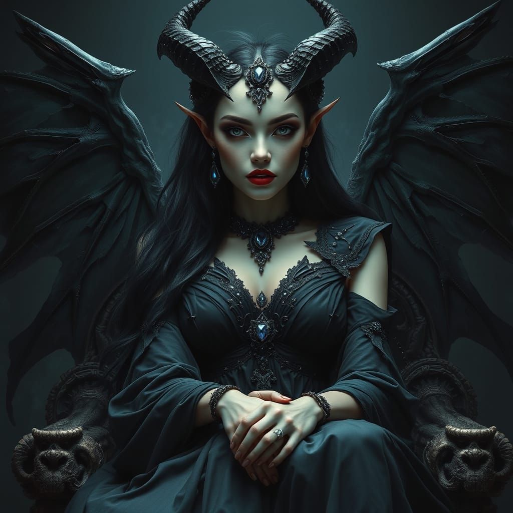 This image shows a stunning, darkly majestic demon queen exuding both danger and allure, with piercing blue eyes and a regal presence commanding awe and reverence.