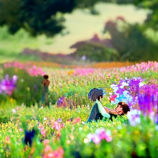 This image showcases a couple amidst a vibrant field of flowers, rendered in the detailed and beautiful style of anime concept art with natural lighting.