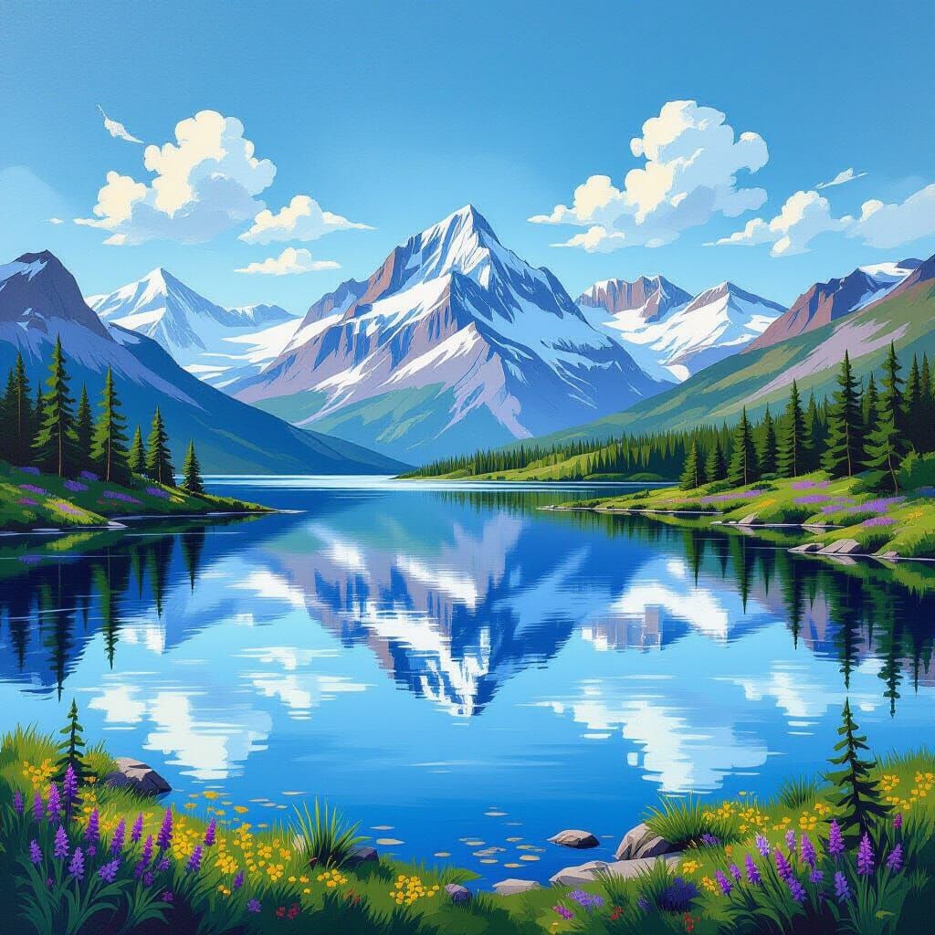 A serene mountain pond reflects snow-capped peaks and a clear sky, surrounded by pine trees and wildflowers. Rendered in an epic impressionist style with thick, textured gouache brushstrokes.