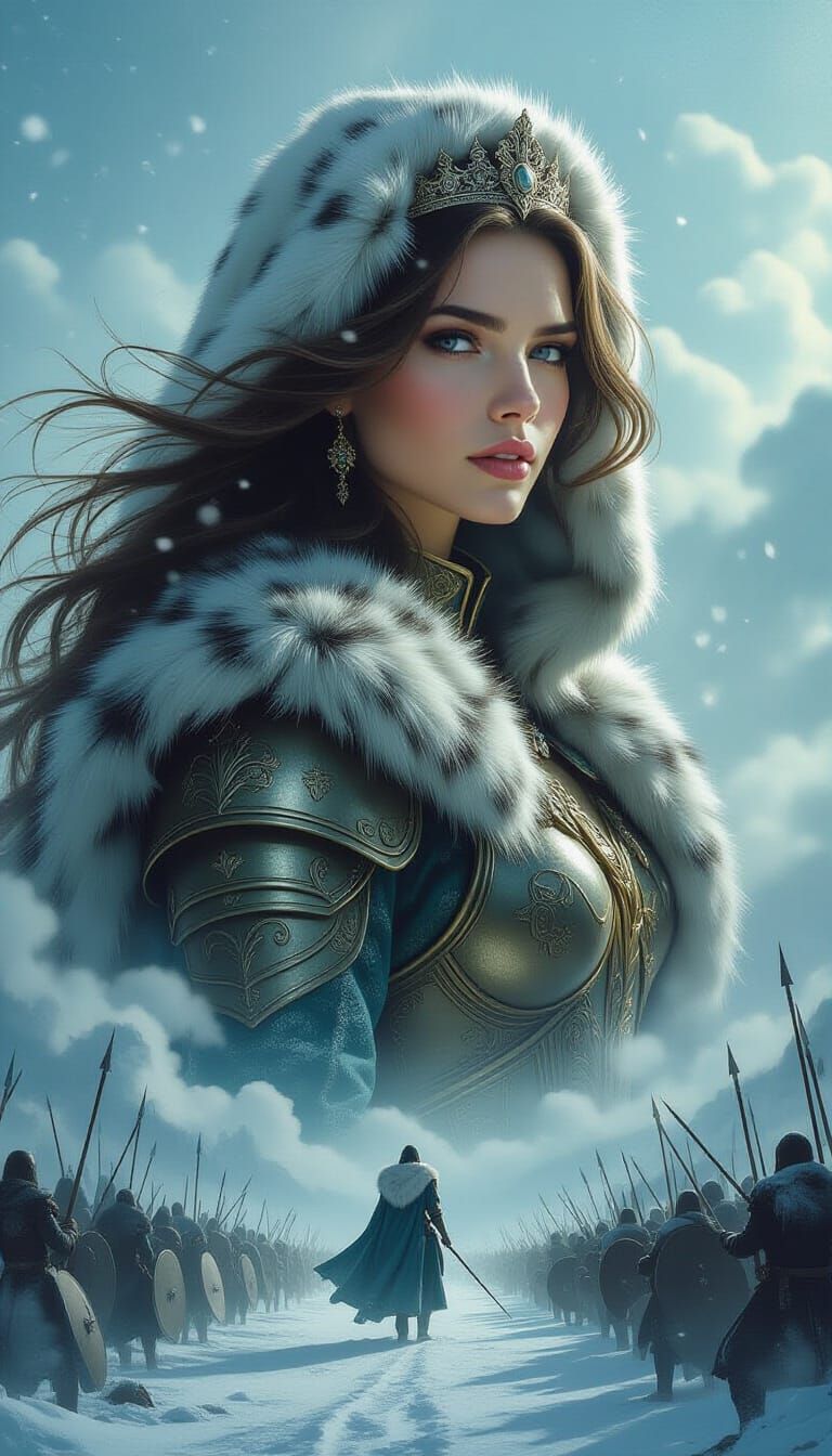A striking picture of a young queen with flowing hair overlooking a snowy battlefield. The image blends two scenes with an oil painting aesthetic and dramatic lighting, similar to classic fantasy art.