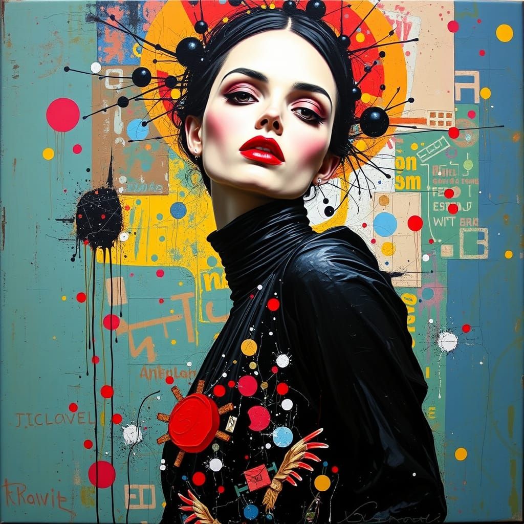 This image shows a fashion model rendered as an abstract oil painting. The bizarre background and pop art style give the image a surreal, screen-printed aesthetic.