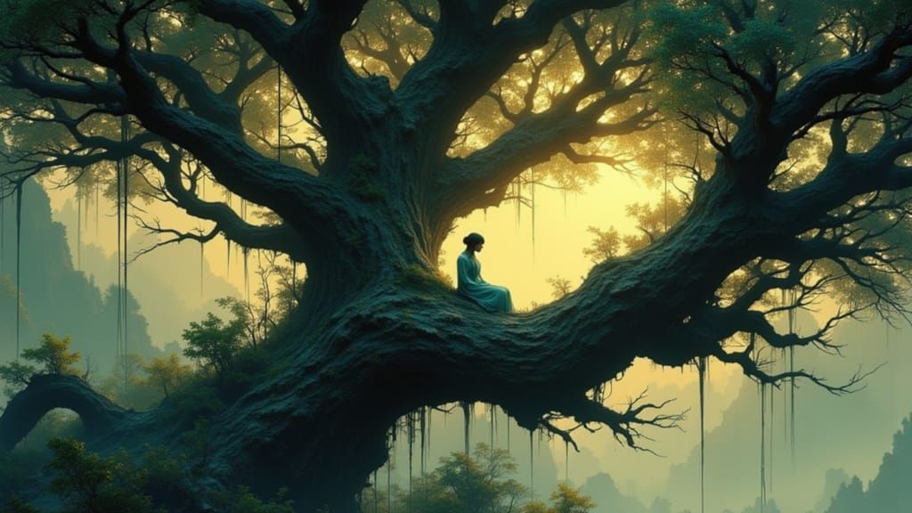 This hyperdetailed 8k concept art portrait shows a lone figure on an ancient oak tree, featuring dynamic lighting and a striking triadic color palette. Rendered in Unreal Engine 5 with volumetric lighting.