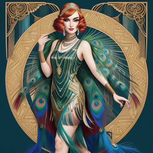 This image shows a young woman in a stunning Art Deco flapper dress, adorned with peacock colors, gold accents, and beaded fringe, walking confidently down a runway with her bright red hair and makeup perfectly in place.