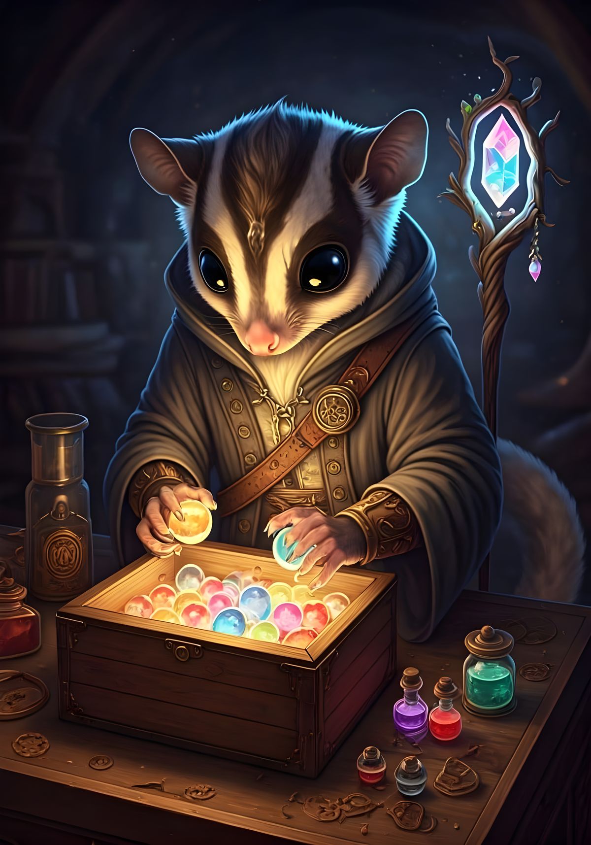 A close-up view of a sorcerer, a sugar glider with soft fur and large eyes, rummages through a box of glowing magical orbs on a steampunk enchanted table, surrounded by vibrant textures and warm lighting.