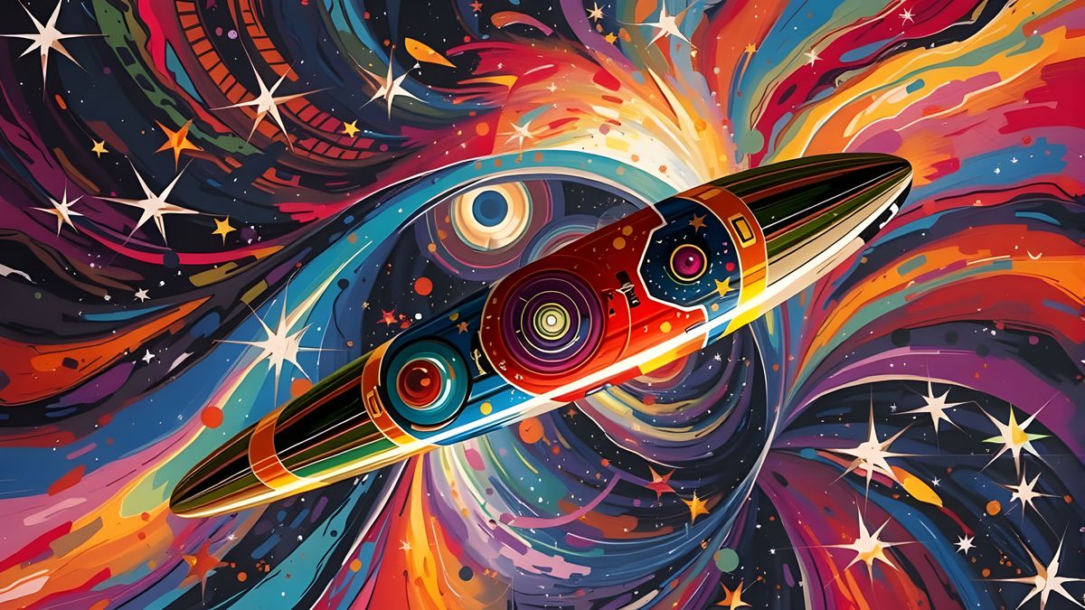 A vibrant and infinitely detailed image of a spinning metallic cylinder reflecting an iridescent cosmos. The cosmic scene is rendered with vivid colors and expressive brushstrokes, reminiscent of surrealist painting.