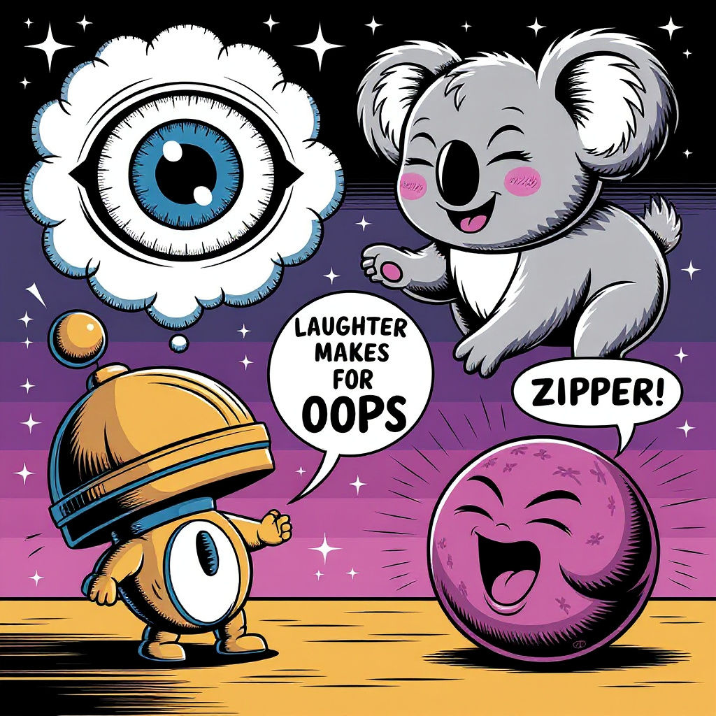 This image shows a playful koala wearing a bright, gleaming hat, surrounded by a whimsical cloud in a joyful and lively scene, blending fantastical elements with a sense of carefree laughter