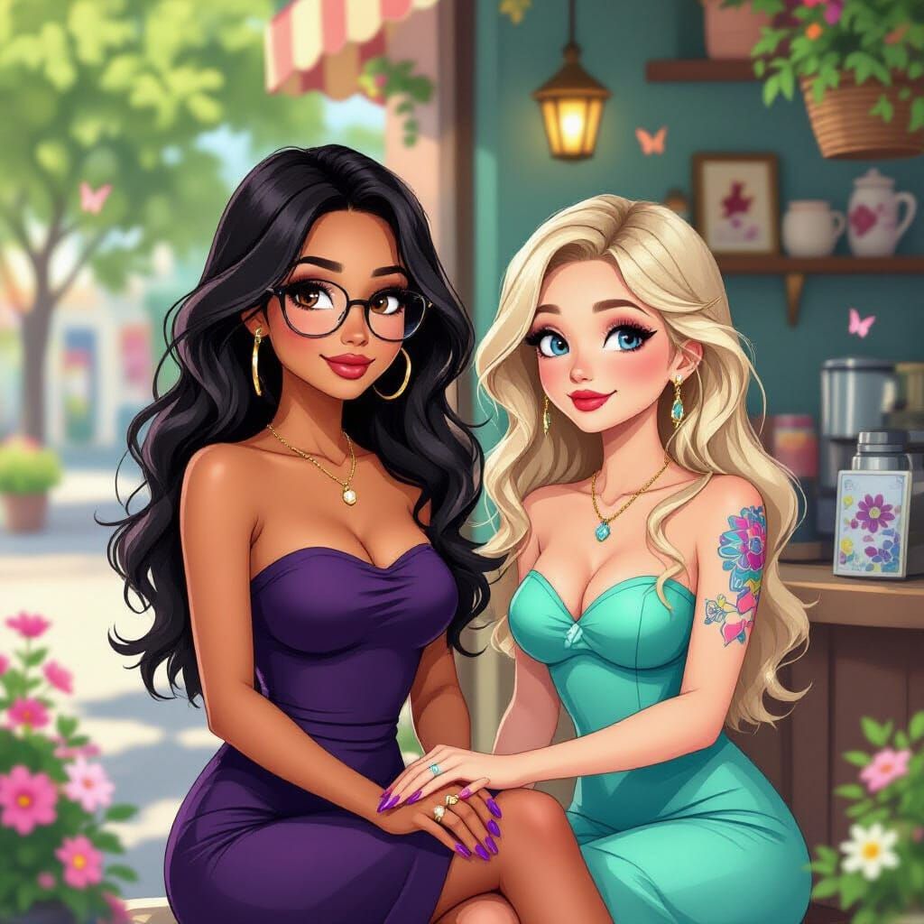 This image shows two animated women outside a charming coffee shop on a sunny day. One has black hair and the other is blonde, in a whimsical style reminiscent of animated movies.