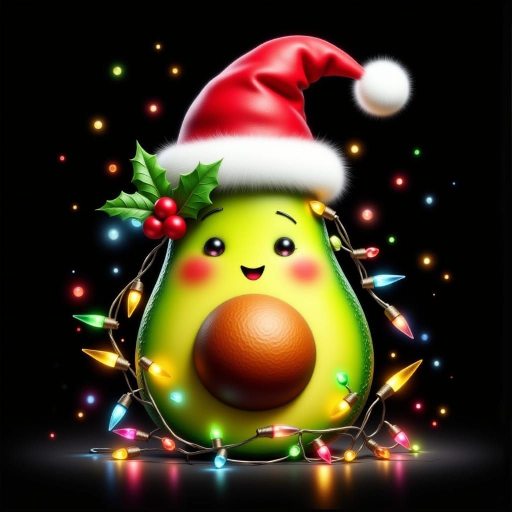 This image features a high-resolution digital illustration of a cartoon avocado dressed as Santa Claus. It has a cheerful face, a festive hat with lights, and is set against a black background. Cinematic lighting enhances the detail.