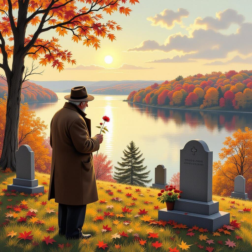 A poignant image of an elderly man with a flower at a graveside, set in a peaceful cemetery with a view of the Hudson River. The artwork evokes a nostalgic, cinematic style.