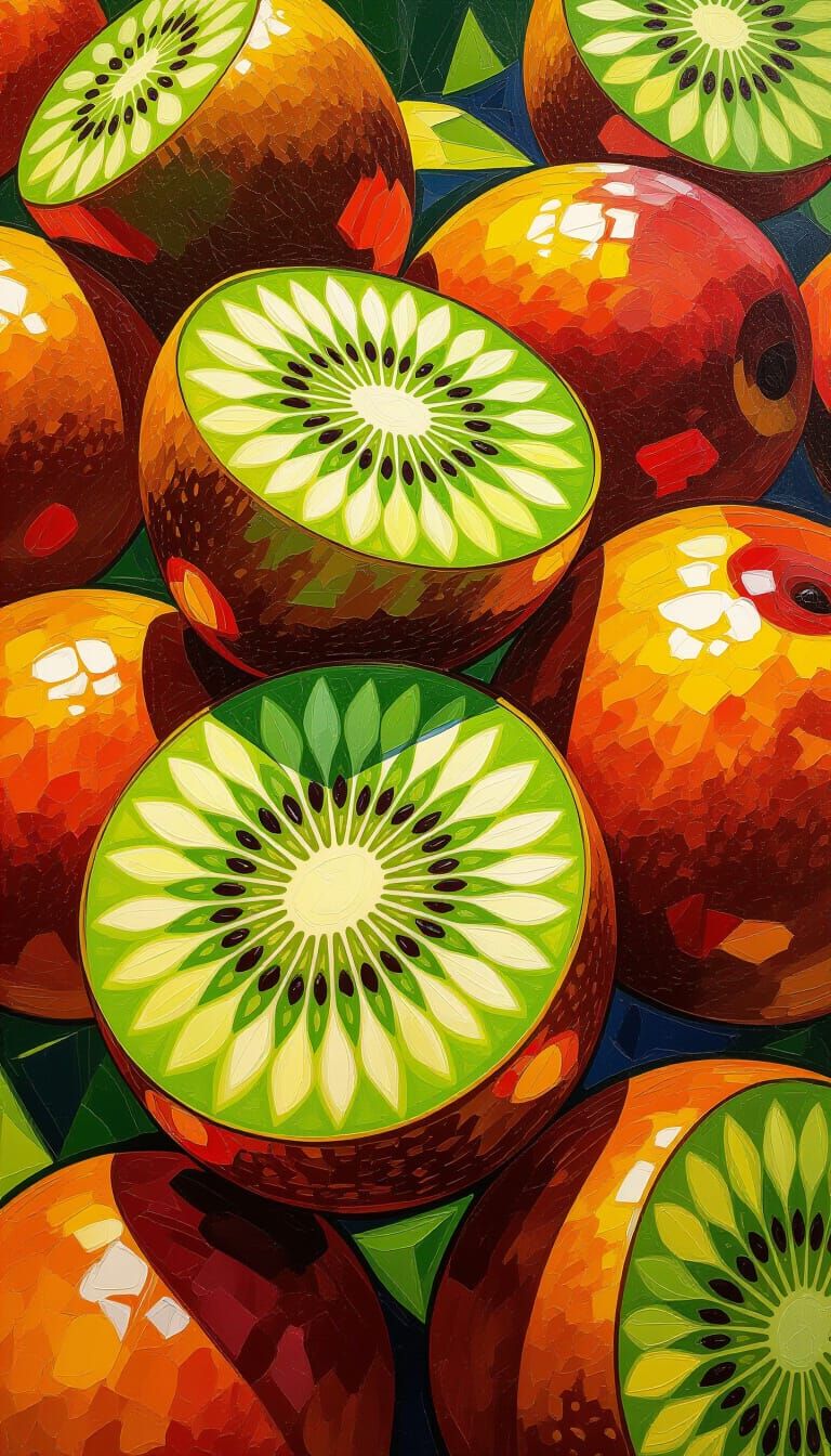 This image shows ripe kiwi fruit in a vibrant, close-up oil painting. Thick brushstrokes create rich texture, highlighting glistening juice in a joyful, dynamic composition.