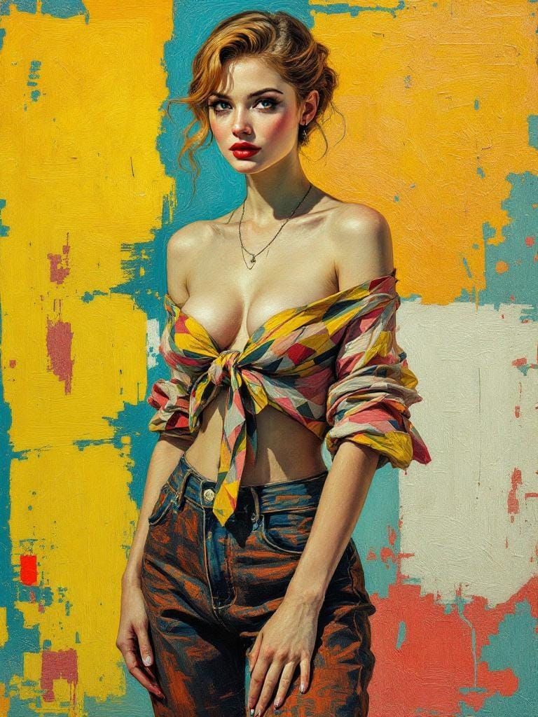 A striking picture of a 1950s pin-up woman in rolled jeans. The artwork blends constructive brushstrokes and dynamic impasto, reminiscent of post-impressionist paintings, with intense color.