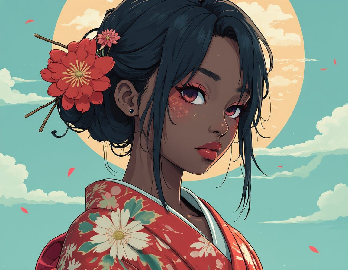 This digital painting blends anime and Ukiyo-e styles, depicting a Black woman in a kimono with a spiritual tone and close-up perspective. Features practical lighting.
