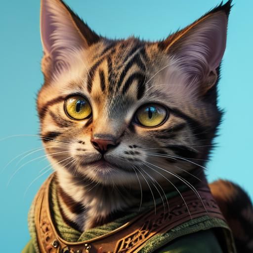 A hyperrealistic image showing a Tabaxi kitten dressed in villager clothes. The mid-shot concept art features intricate details, a colorful background, and dramatic side lighting.