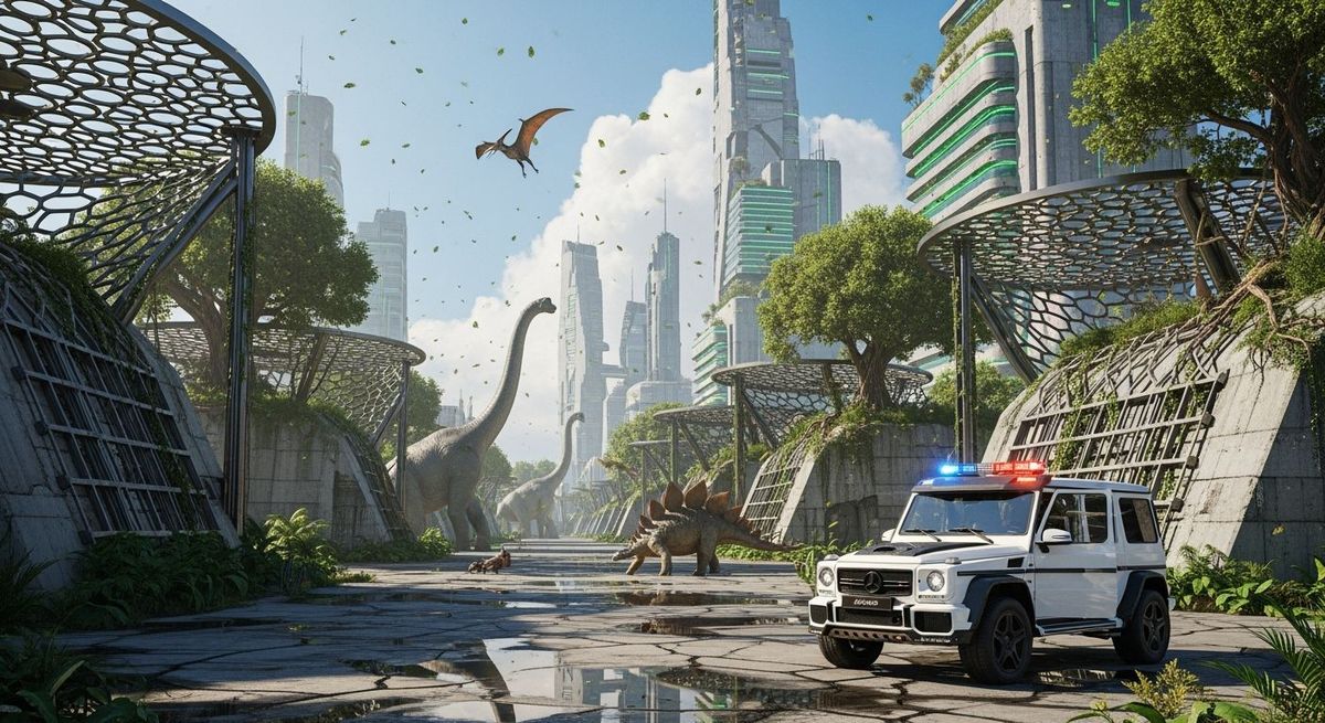 This conceptual digital painting depicts a spacious, brutalist concrete industrial zone overgrown with jungle. It features futuristic skyscrapers, dinosaurs, and a military SUV, rendered with realistic colors and brilliant reflections.