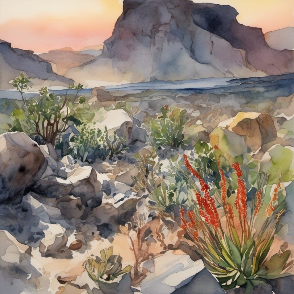 This image shows a watercolor painting of an alien landscape filled with strange plants and rock formations. The artwork emphasizes dramatic light and shadow at sunset with vibrant colors.